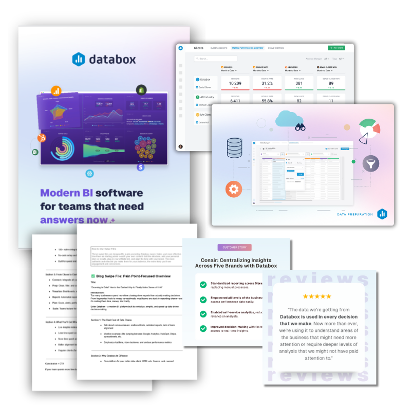 With Databox, teams can ask real business questions in plain conversational language, get answers with visual context and explanation, and take action without managing complex pipelines, warehouses, or analyst-gated workflows. More than 20,000 businesses and agencies use Databox to align teams, save time, and manage performance more deliberately.