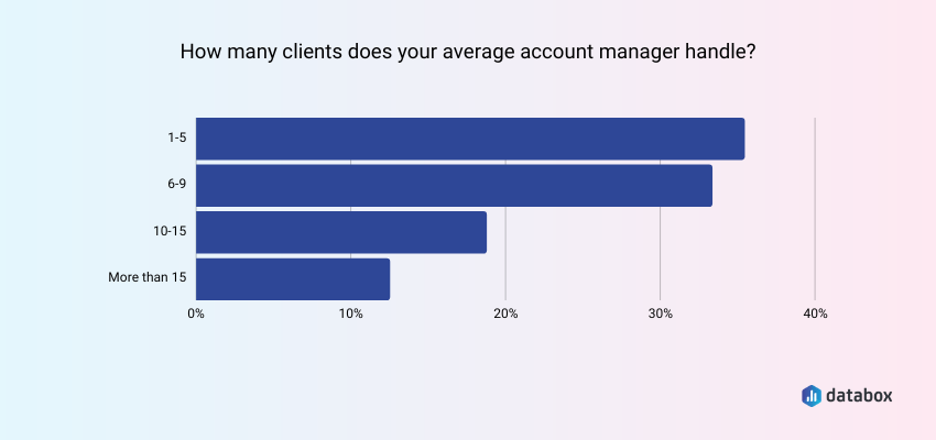 According to Databox research on agency account management, nearly 70% of agencies report their account managers currently handle up to 10 accounts.