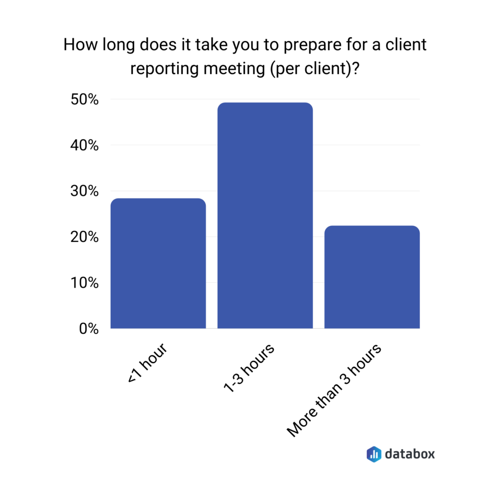 The efficiency case is straightforward. According to a Databox survey on client reporting meetings, 49% of agency teams spend 1–3 hours preparing for a single client reporting meeting per client — before a single insight has been delivered. Multiply that across 15 accounts and reporting mechanics become a part-time job. That is a fully solvable problem.