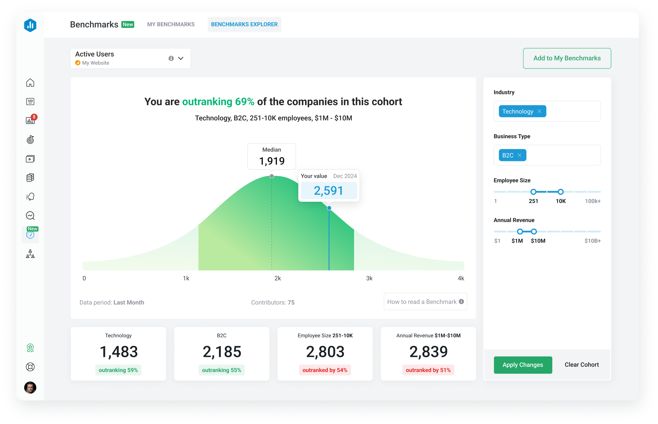 Benchmarks are calculated on a monthly basis, using data from all contributors within the defined group. You can learn more about the mathematical calculations here.