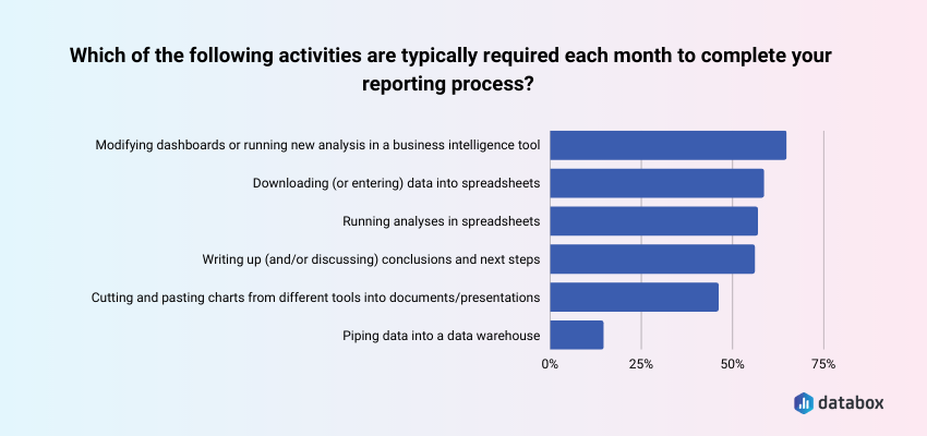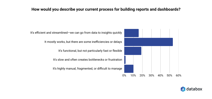 - According to Databox’s Time to Insight survey, 54.29% of teams say their reporting process has inefficiencies or delays.