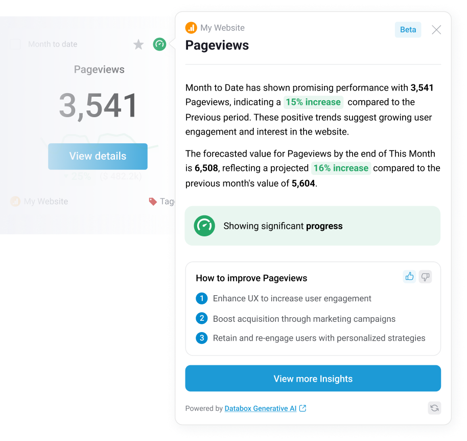 Detect trends and predict future outcomes with Databox AI-powered features. By harnessing the power of AI, you can set more realistic goals, make more informed decisions, and stay ahead of the competition.
