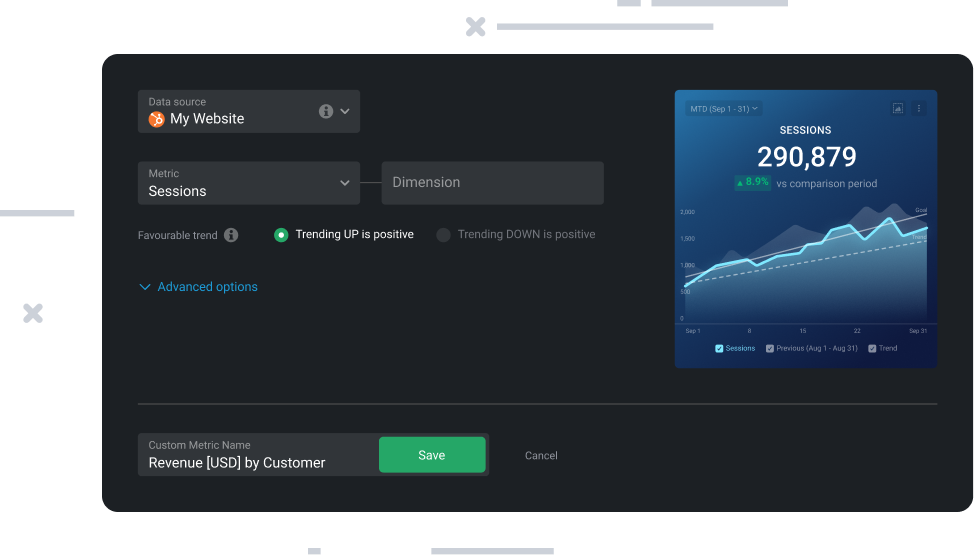 Don’t settle for surface-level metrics. Databox’s Metric Tools, allow you to create new metrics that give you a better understanding of your performance. Access additional data, add dimensions and filters, or build custom formulas with no coding experience required.
