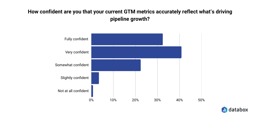 The Databox “Beyond Attribution” survey found that only 41% of go-to-market leaders are very confident their current metrics accurately reflect what’s driving pipeline growth. Confidence is a prerequisite for letting data direct decisions rather than decorate them. The majority of executives are operating without it.
