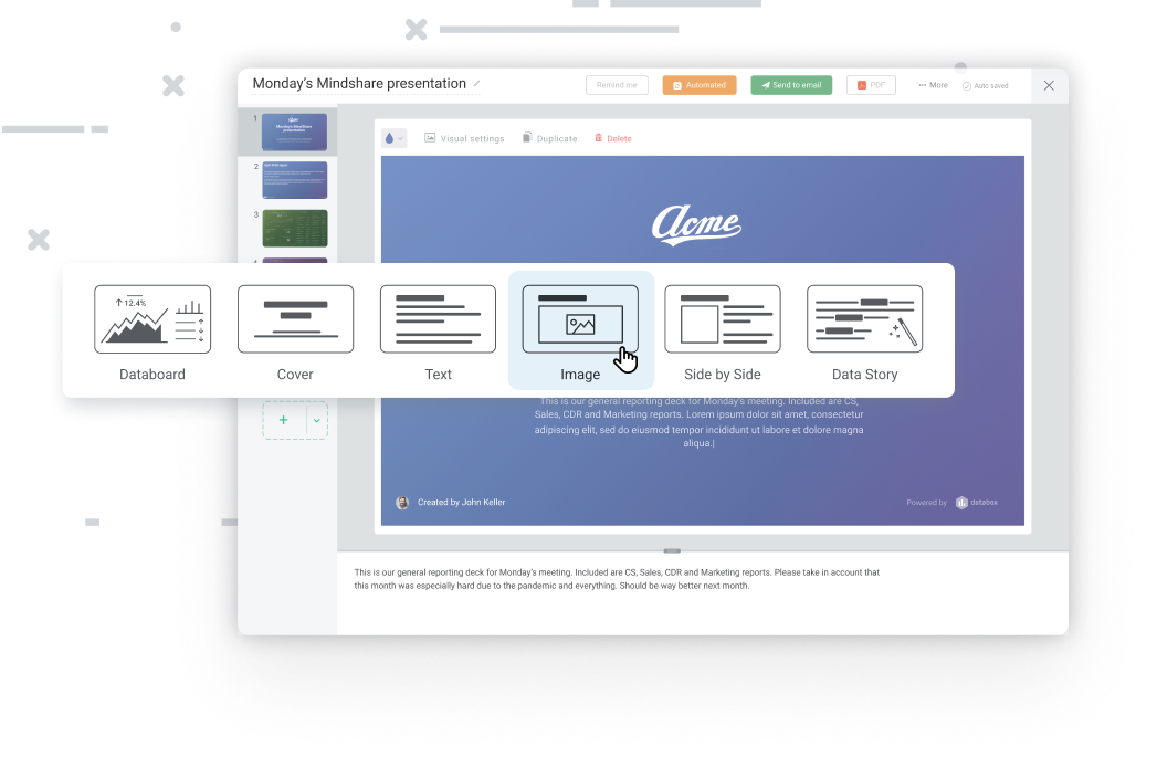 Craft compelling reports using a variety of slide types, including text, images, data visualizations, and pre-built dashboards. Automate your reporting process with scheduled exports and set reminders to keep everyone on the same page.