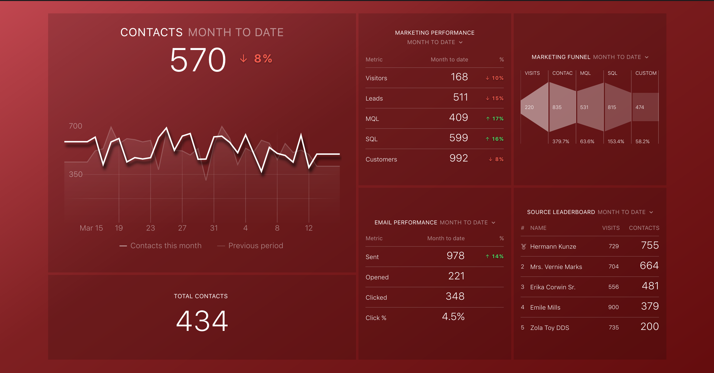 The most important part of this datablock is the percent change from the previous time period, so you can compare current performance to the historical performance. For all but one of these metrics (closed lost deals), make sure the trend is up and to the right, or in this case, green.
