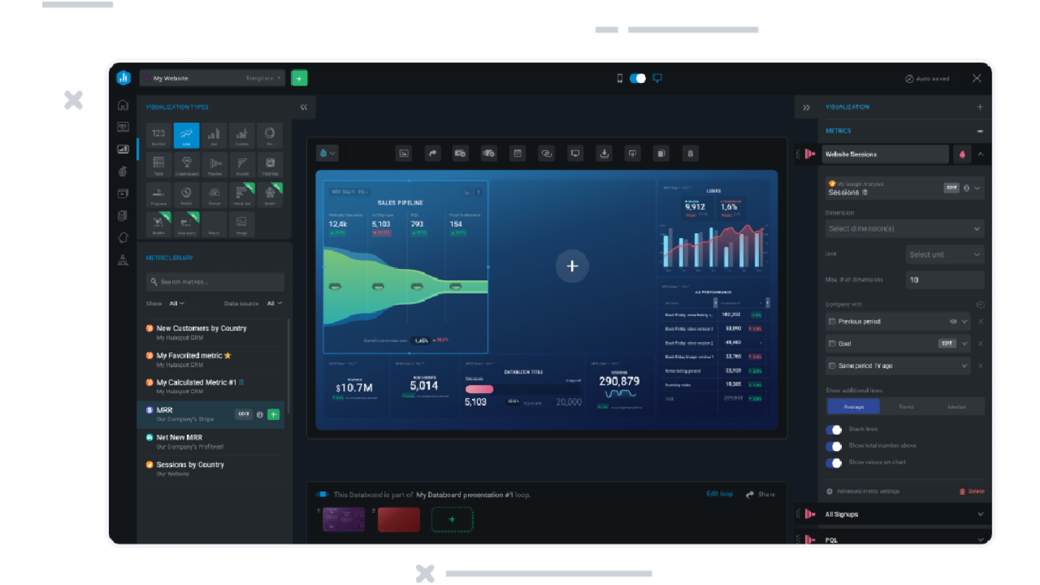 As soon as you connect your first Data Source, you’ll be able to browse a library of 4,000+ pre-defined metrics. If you can’t find the metric you need, you can create additional custom and calculated metrics using the Metric Builder and Metric Calculations features. No coding skills are required!
