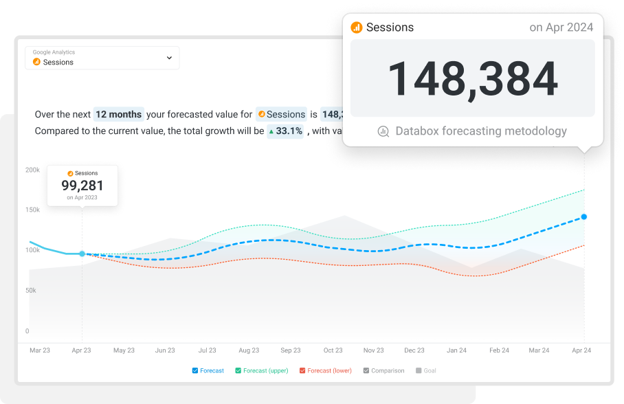 We understand that confident prediction requires leveraging cutting-edge technology. With Databox Forecasts, you’ll have a better idea of what the future has in store for you and your clients. Identify trends, set more realistic goals, and align client expectations with the power of AI.