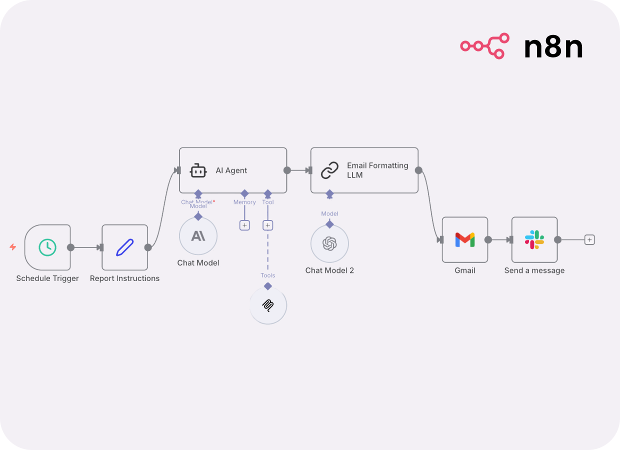 Because AI stays connected to your systems, insights can be turned into recurring summaries, updates, follow-ups, and workflows that run automatically.