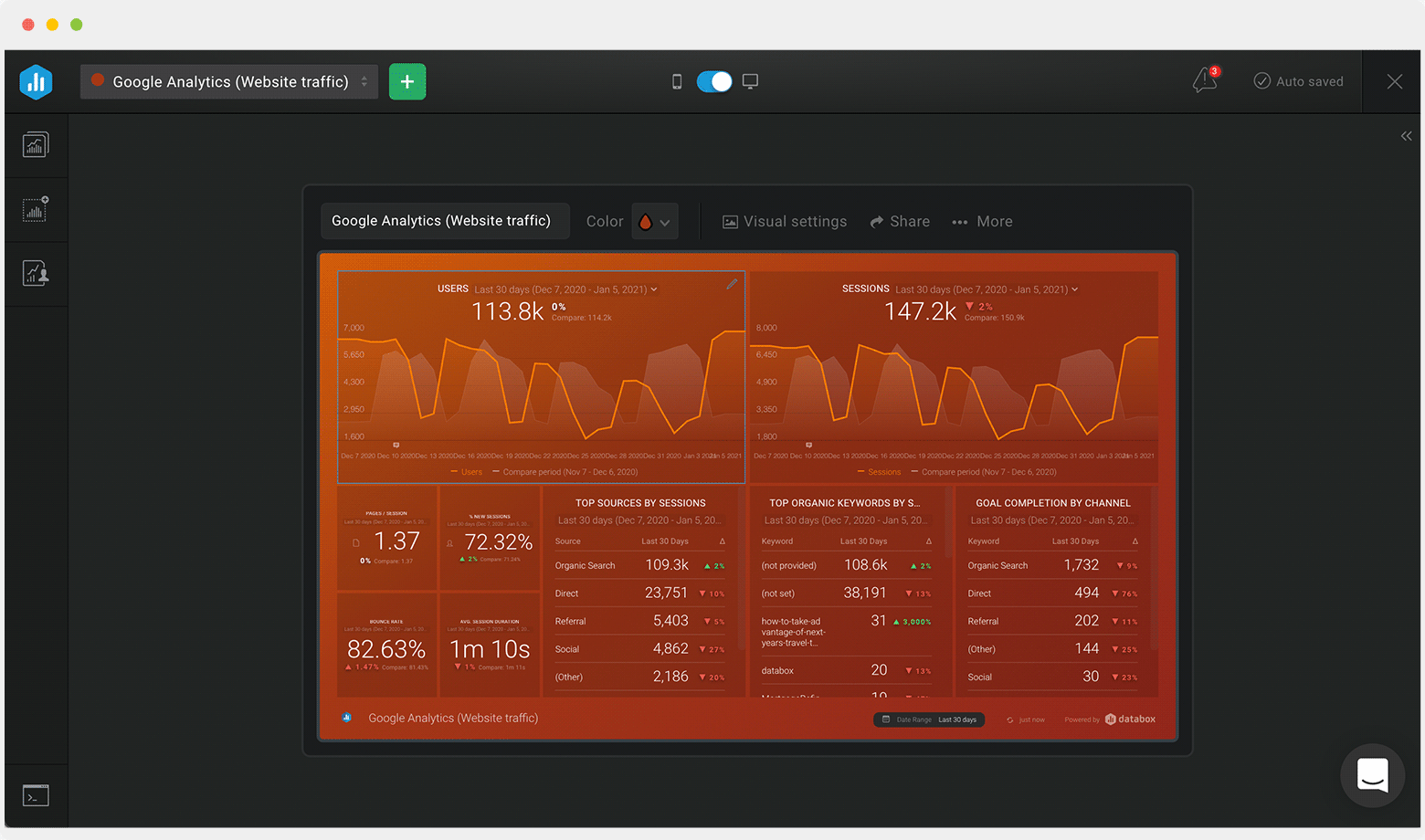 Share. Share data with your team by email right from the app. Push or pull in data to Slack.