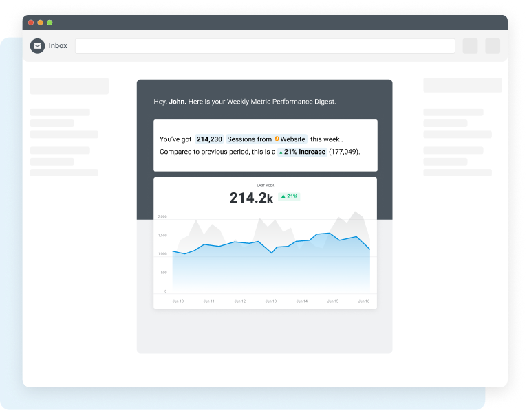 Proactively monitor your performance with Databox’s built-in notification system. Set targets and track progress with Goals, stay updated on top metrics with Scorecards, receive tailored notifications with Alerts, and gain detailed metric updates with the Metric Digest. The best part? Your notifications will be delivered where it matters most to you – Slack, email, push notification, and more.